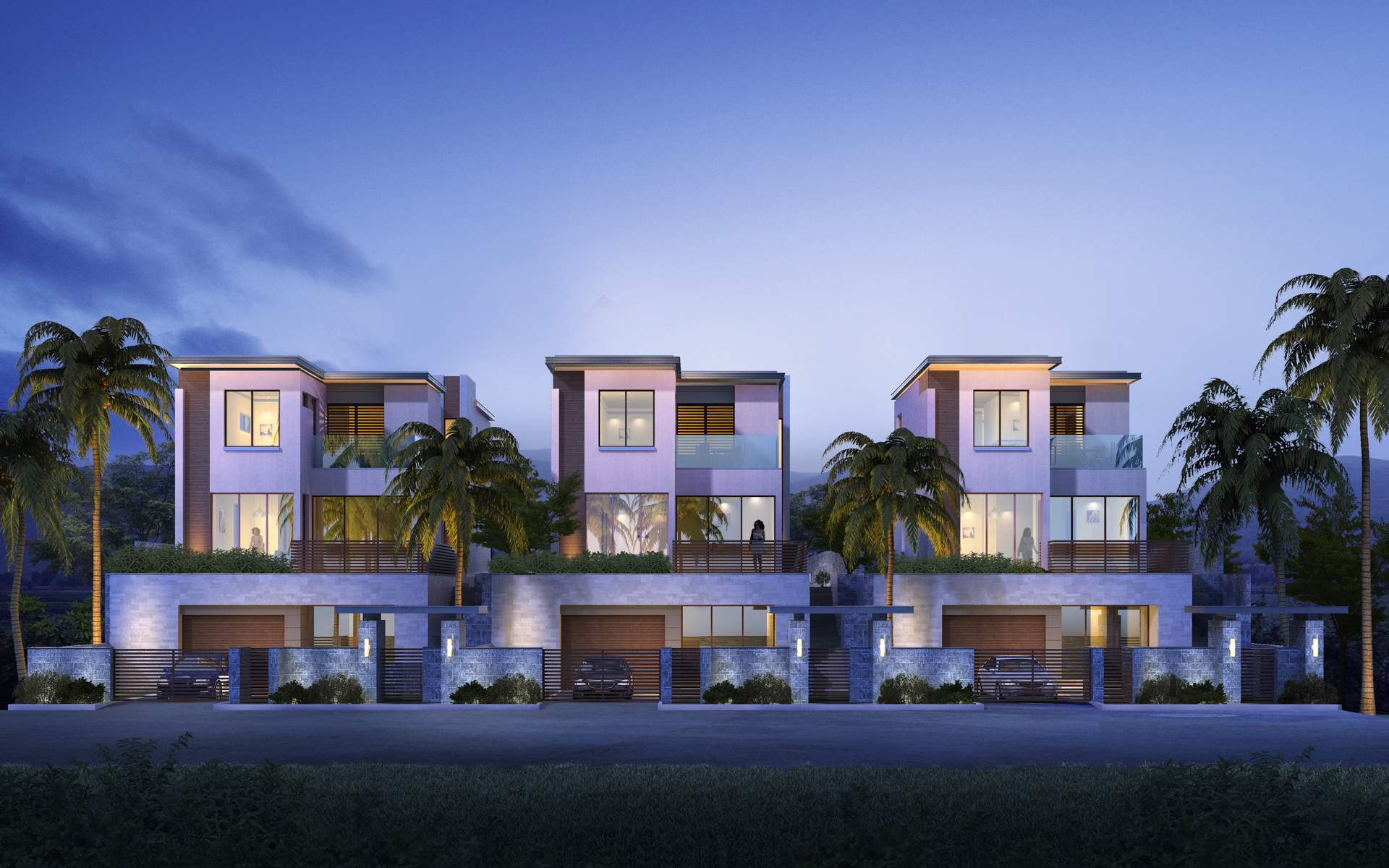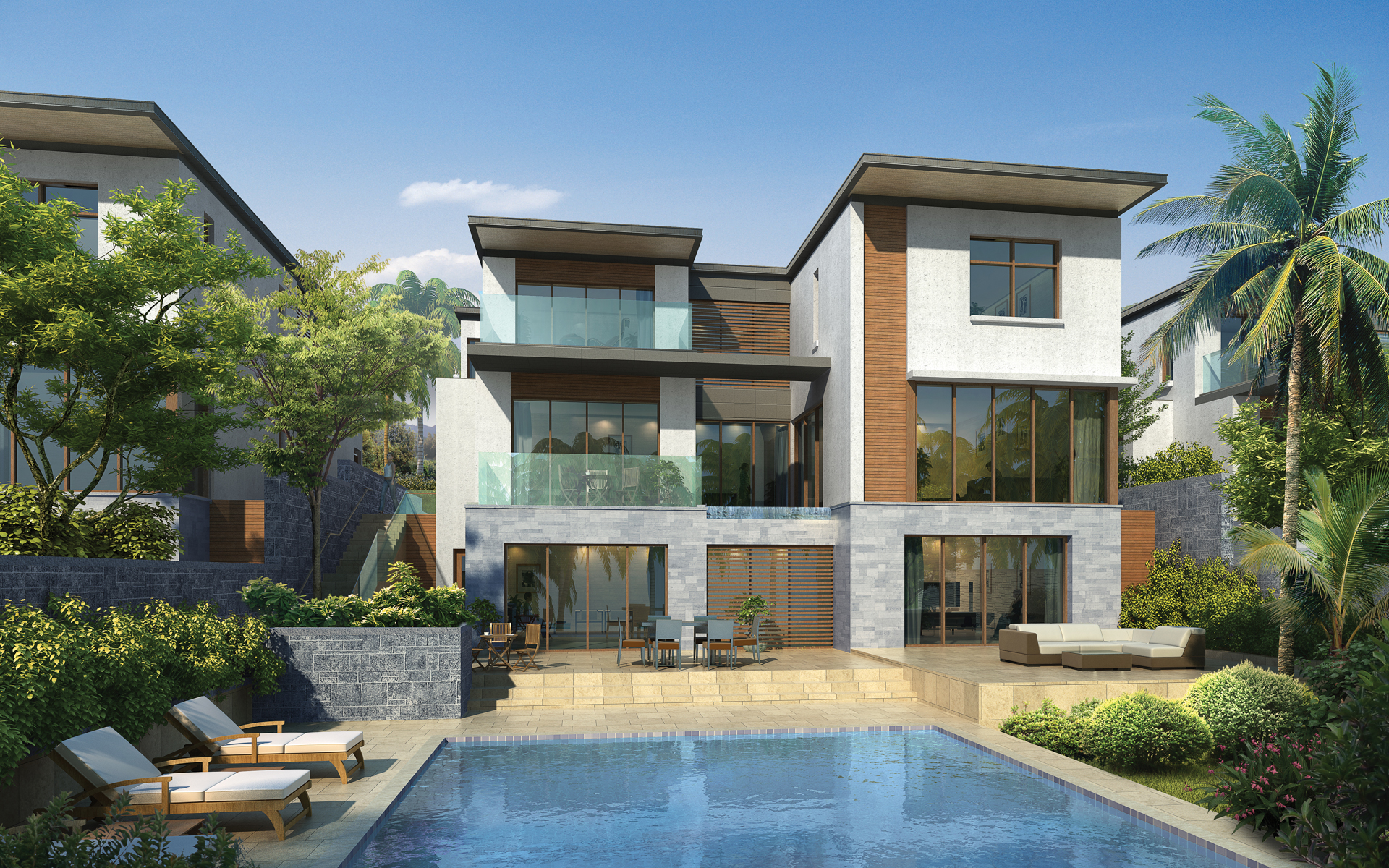 The Cam Ranh Villas are a collection of golf fronting contemporary homes which feature 3 storeys terraced into the hillside with private pools, gardens and patios. The villas are single family homes in three ranges of house and lots sizes; the goal of which is to capture different demographics of the real estate market. The homes are oriented towards the views with some villas having uphill access and others with downhill access from the street. The housing style is uniquely modern and captures the essence of resort living in this climate and mountain-side setting. The large overhanging roofs provide shade in the intense mid-day heat while the large windows provide views and strong connections to the landscape. The design of the homes encourages a lifestyle that utilizes the surrounding outdoor gardens and patios as extensions of the interior rooms.