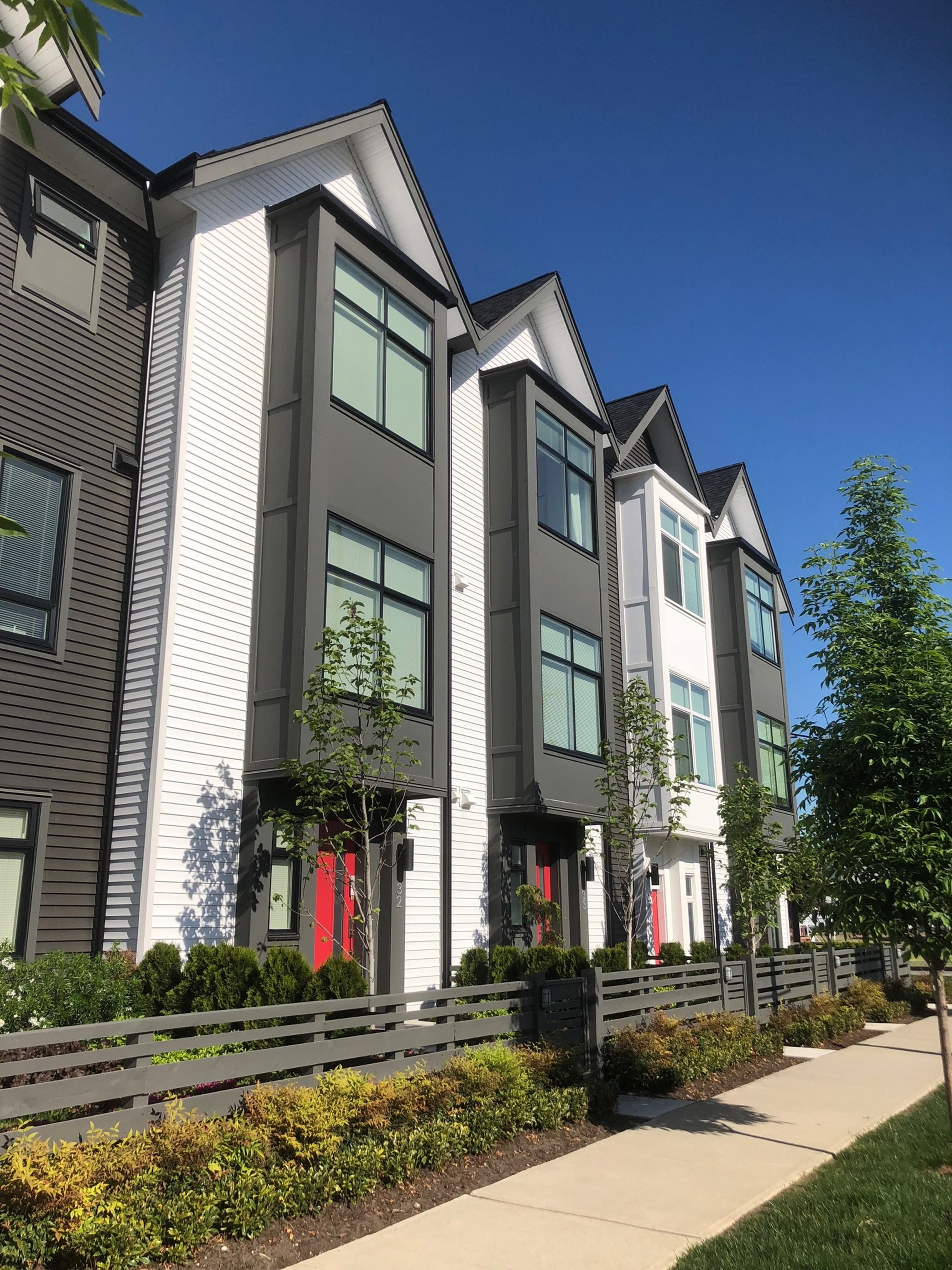Located on a 4 acre site in Cloverdale this neighbourhood is a bold collection of town homes with a mono chromatic “saltbox” architectural style. This is complimented with bold door colours defining each home’s entry. The development is a combination of back to back town homes and more conventional single loaded rowhomes. A central amenity building for community gatherings is also located on site and designed to complement the architecture of the adjacent homes.