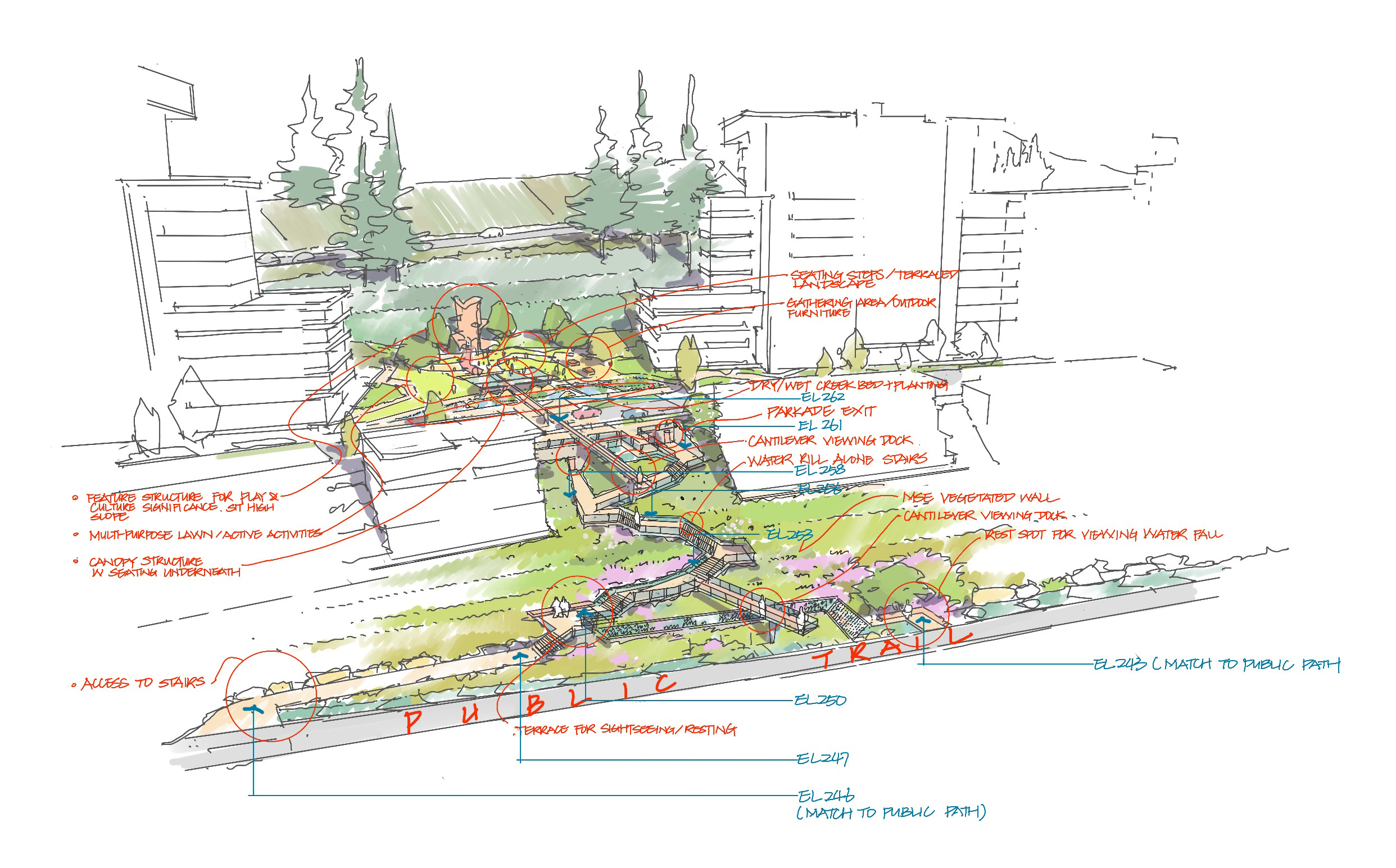 Every project has its own unique story, and Rise West Vancouver at Rodgers Creek is no exception. Situated within the stunning natural backdrop of the mountainous landscape, this project offers breathtaking views of Vancouver and its surrounding regions. The landscape design draws inspiration from the land’s inherent beauty, incorporating a range of local geological features—mountains, ridges, creeks, plateaus, and valleys—that characterize this dramatic setting.