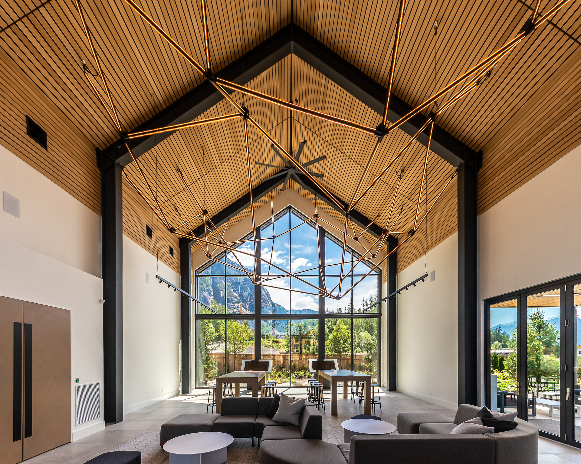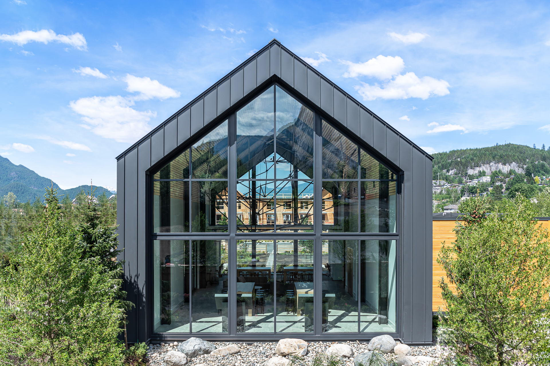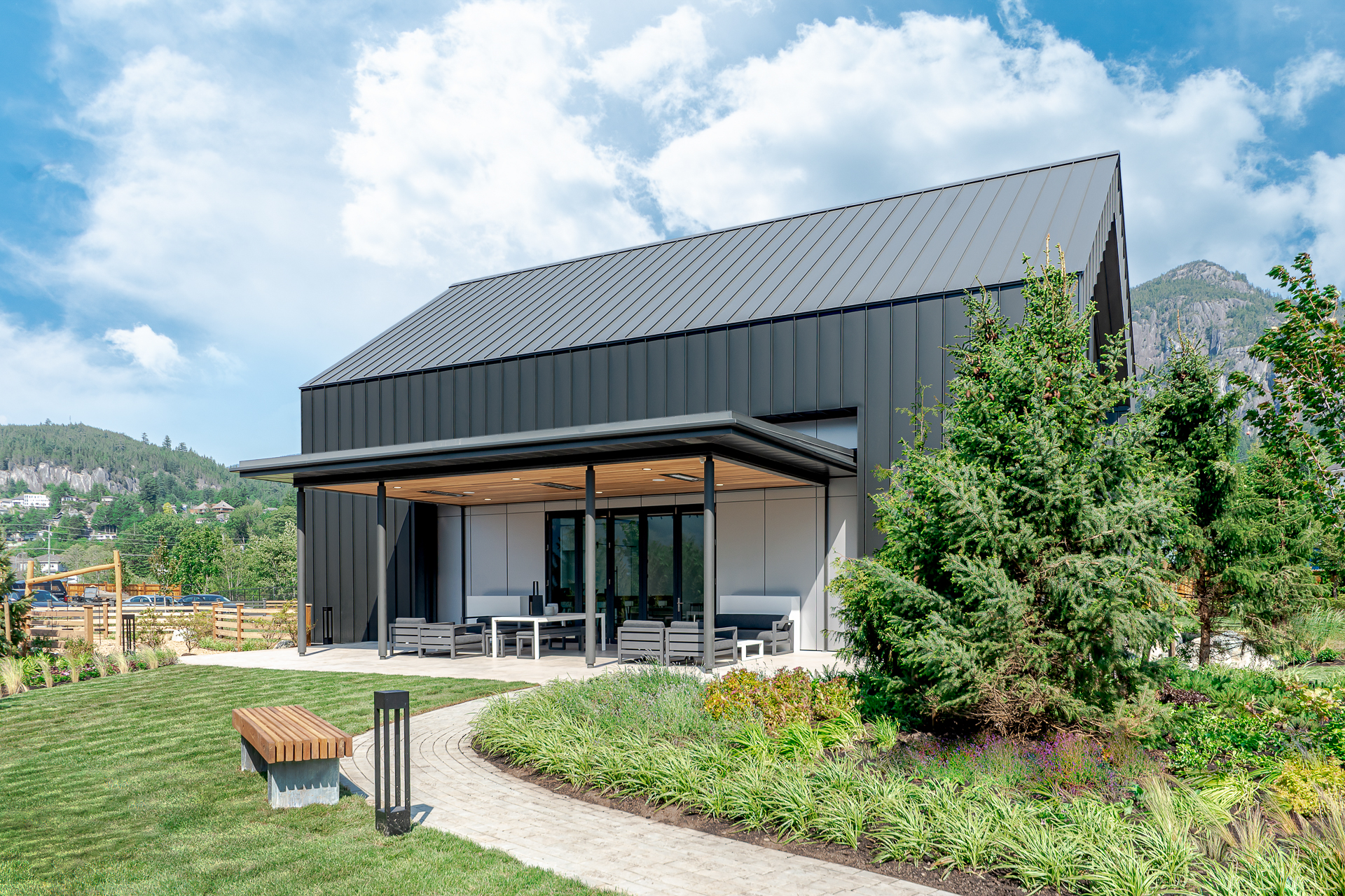 Designed to set the tone for this ambitious master planned community at the gateway to Squamish, the presentation centre is a bold statement designed to acknowledge the former industrial mill that occupied the site and the stunning surrounding landscape. A combination of metal cladding and natural wood siding complements the architectural form. The extensive use of glazing also takes in views of the Chief, a revered and iconic rock face, from the main sales hall. Designed to be moved at the conclusion of the developmentās sales program, the building will be re purposed on another site.