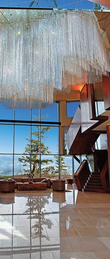 The hotel focuses on health and well-being, with its extensive European Style Spa treatments. The hotel rooms occupy the upper levels of the building providing views in all directions; over the lake and surrounding mountainsides. Two restaurants, a wine bar and entertainment and conference rooms round out the offerings of this mountain top resort.