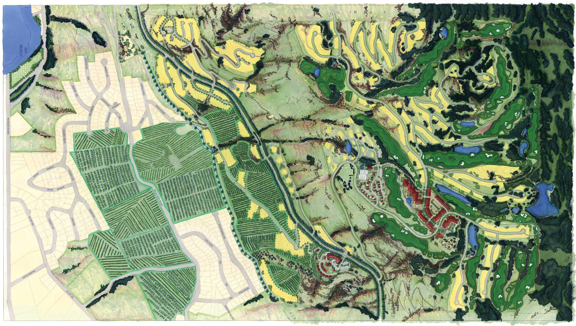 The Rise is a 735 acre hillside resort community master planned by EKISTICS. Taking advantage of the spectacular views and varied landscape of the Okanagan Valley, The Rise incorporates a diversity of low-density residential uses, resort commercial opportunities, a working vineyard, retail winery, and a comprehensive network of parks and trails surrounding the open fairways of an 18-hole championship golf course. Adjacent to both the historic YK Ranch and Indian Reserve #1, the new resort community required a thoughtful, open, and responsive planning process to ensure its sensitive integration into its surroundings. With a development yield of 1,210 units, composed of both residential and resort commercial accommodation, The Rise promises to be an exciting new neighbourhood and tourist destination for Vernon, British Columbia.