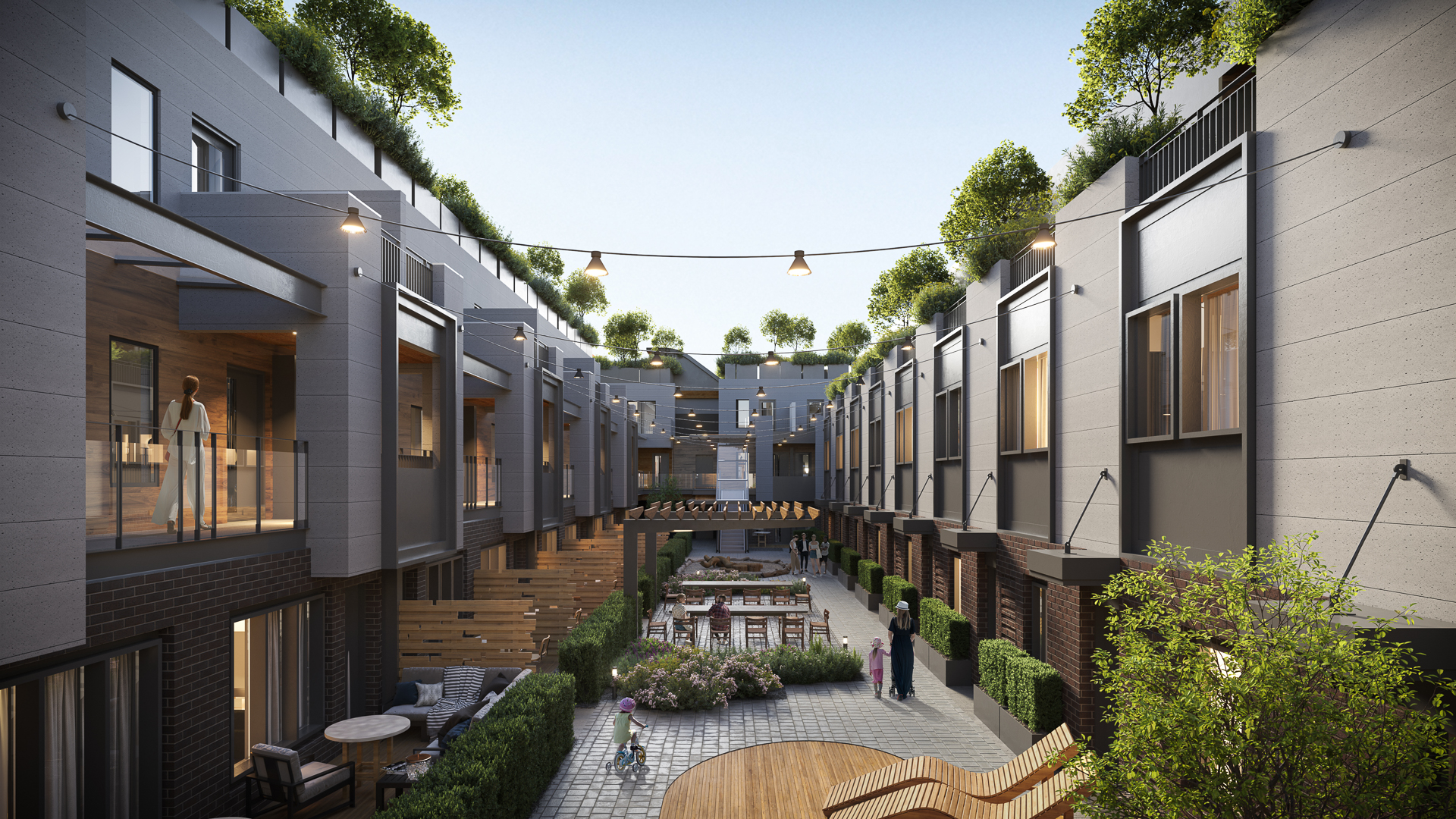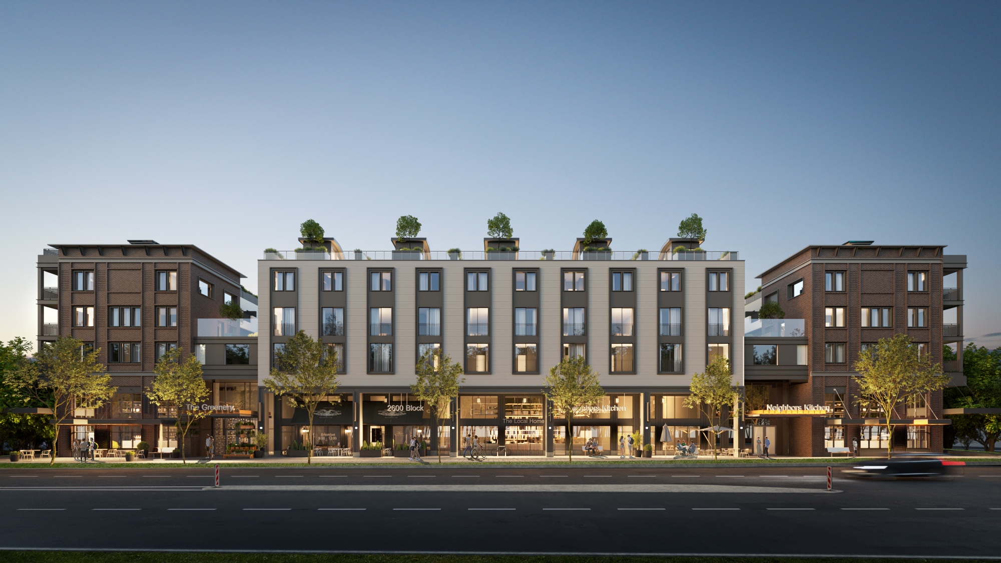This 5 Storey Mixed Use Multi-residential Project is an innovative form of development offering family-friendly missing-middle high density housing in a 5 storey City of Vancouver C-2 zoning envelope. The development features high ceiling commercial retail along Nanaimo Street, with ground-oriented townhomes along the side-streets and lane. The townhome style residential units on the upper levels of the project are accessed via a richly programmed exterior courtyard amenity space featuring play areas, gathering spaces, common BBQ/dinning areas and an indoor amenity space with gaming, entertainment and kitchen areas. Every residential unit has access to a generous outdoor space, either in the courtyard or on the roof.  The design is neighborhood friendly and street oriented, inspired by classic residential blocks of the past.